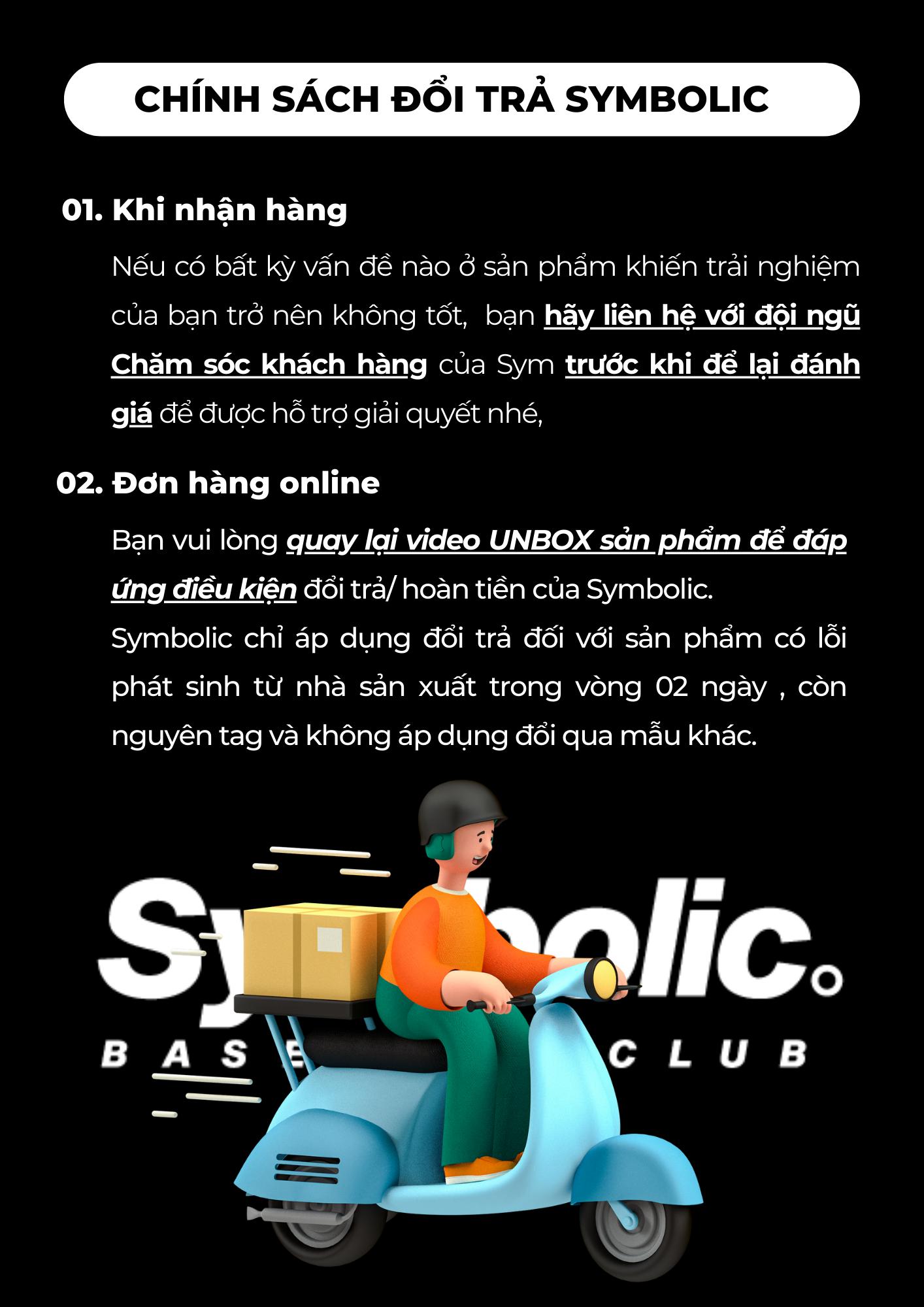 Với sản phẩm đã cắt tag, khách hàng cần phản hồi trong 24 giờ kể từ khi nhận hàng. Sau thời gian này, Symbolic không thể hỗ trợ đổi trả.